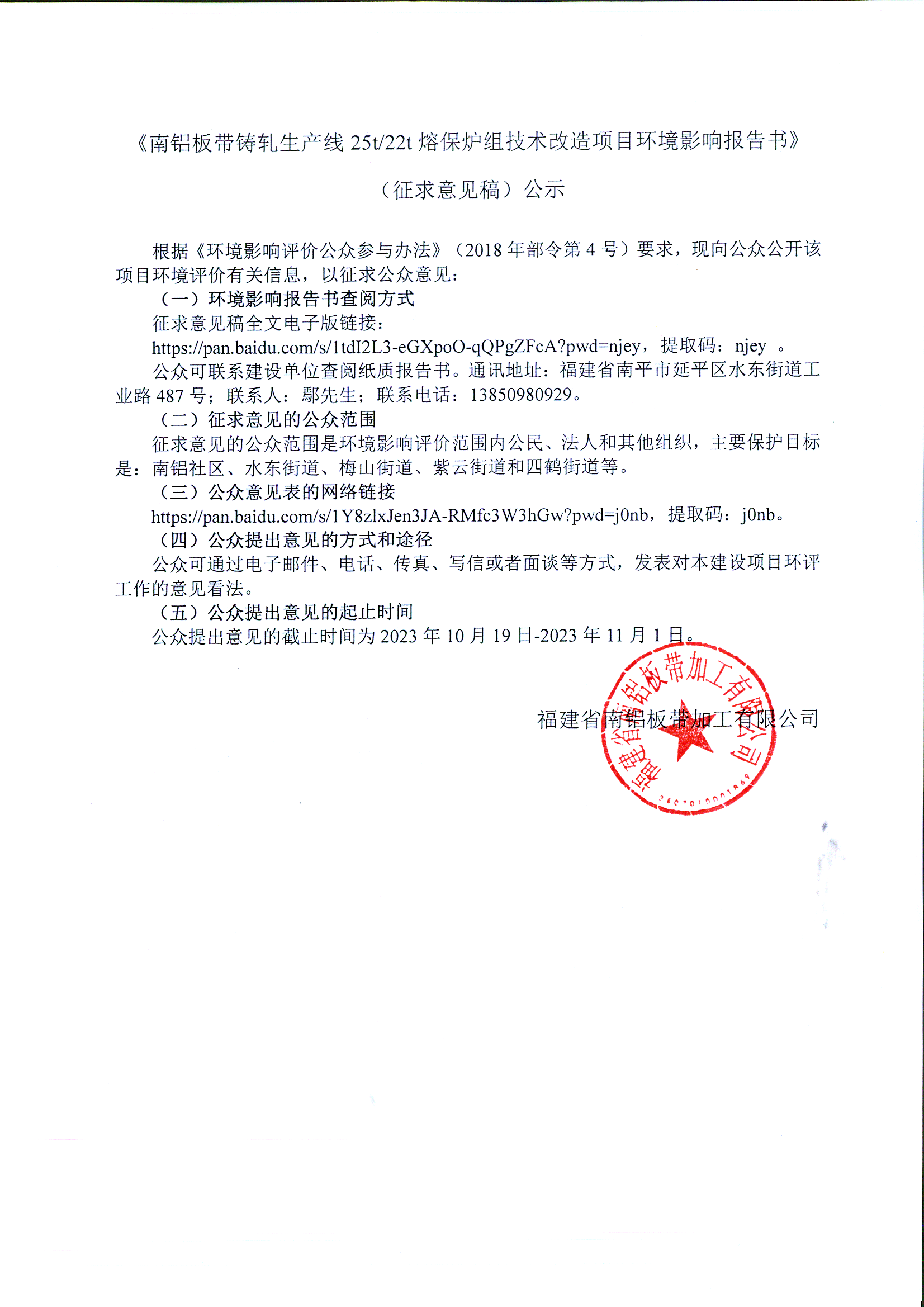 7.2023年排污許可證執行報告 | 《南鋁板帶鑄軋生產線25t22t熔保爐組技術改造項目環境影響報告書》報批前公示 |