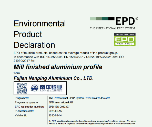 南平鋁業建筑鋁型材全系主導產品獲國際EPD認證